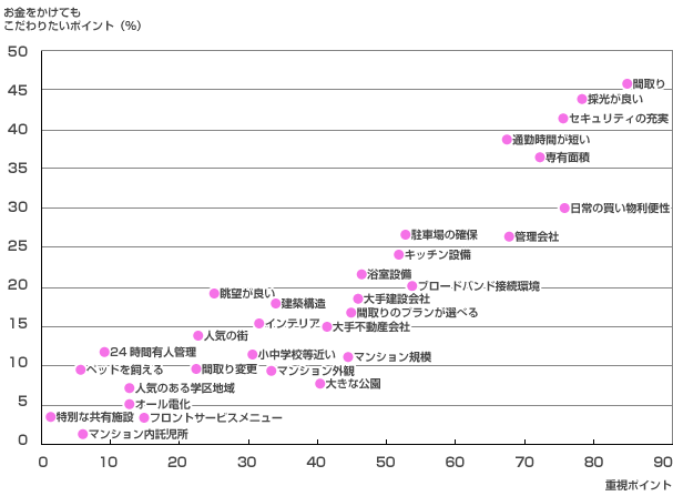 「マンション購入を検討する際、具体的に重視するポイント」と「お金をかけてもこだわりたいポイント」を同じ項目で尋ね、下プロット図に表しました。