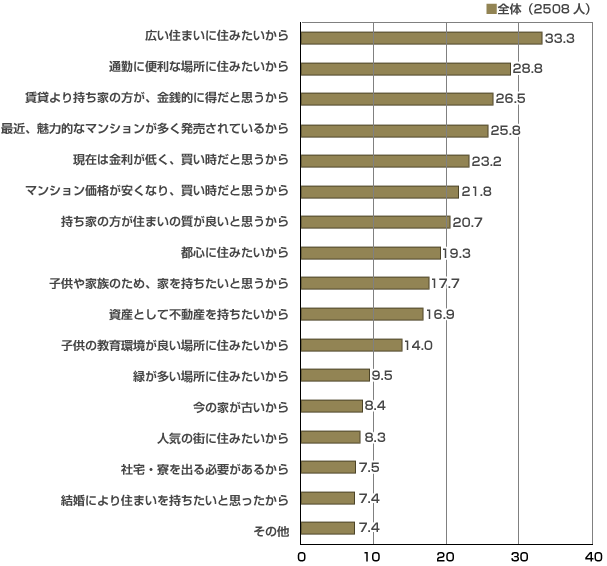 「現在マンション購入を検討している理由」のトップは「広い住まいに住みたいから」で33%。