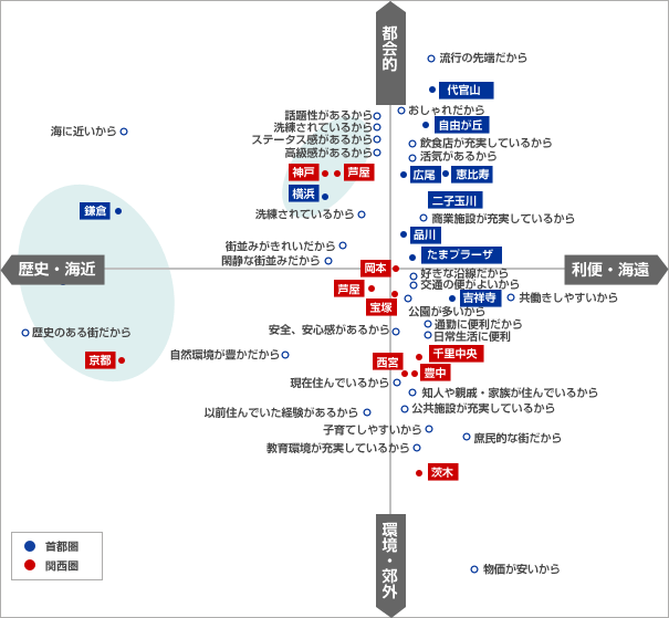 首都圏と関西圏で住んでみたい街トップ10にランクインした街を、住んでみたい理由により分類するためにコレスポンデンス分析(※)を用いました。