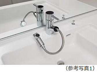 洗面ボウル内に濡れたコップや石けんなどを置けるスペースを設けました。カウンターが汚れにくく、掃除の手間が省けます。