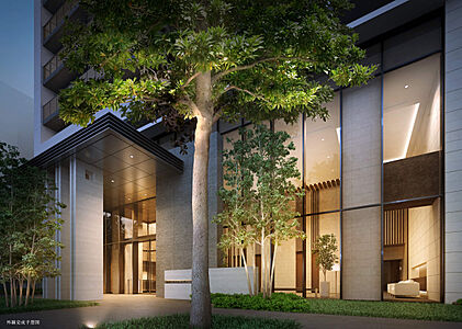 駅前の風景を一新する、上質と洗練をまとうエントランス。大判タイルやガラスカーテンウォールなどで仕上げられた基壇部は、大空の表情をガラス面に印象的に映し出し、圧倒的な存在感を誇ります。