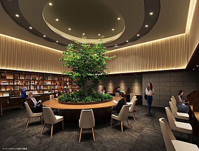ラウンドテーブルを配置したオープンスペースと、個室ブースを備えたテレワークラウンジ。読書や仕事など、新しいライフスタイルに対応した共用空間です。