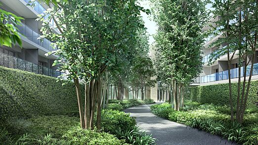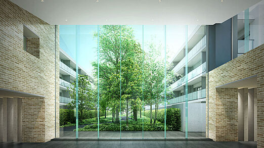 季節を知らせる「緑」を眺める。自然の潤いを身近に感じられるよう、中庭に約12m級のシマトネリコをはじめ、地域性や生態系に配慮した中高木を配置。緑豊かな中庭、南の提供公園側に住戸の主開口部を設けることで、空と緑を暮らしに取り込むプランを実現。