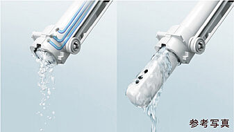 2カ所の吐水口から出る渦を巻くような水流で、汚れを力強く、効率よく洗い流します。