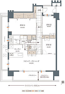 | 備考 | ■リビング・ダイニングに家族共用アイテムの収納に便利な納戸を設置。 ■洋室(1)には大容量のウォークインクロゼットをご用意。 ■洋室(3)の可動間仕切壁を開放すれば約18.2畳の大空間に。 ■リビング・ダイニングには2面に窓を設置し、通風・採光を確保。 |