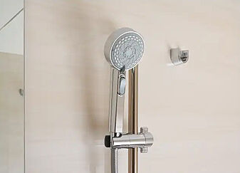 高さ調節が自由にできるスライドバーを採用。グローエ製のシャワーヘッドで水流を4段切替えできる手元スイッチ付きです。