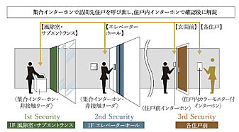 来訪の方は各住戸の居住者と風除室・サブエントランスの集合インターホンで通話後にマンション内にお入りいただきます。 リビング・ダイニングのカラーモニター付インターホンを使い、 音声・映像の両方で来訪者を確認してから解錠する、安心のセキュリティシステムです。※概念図
