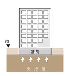 直接基礎とは建物を直接地盤で支持する基礎形式を言います。 当マンションでは支持層となる地層が比較的浅い位置に出現するため、この基礎形式を採用しています。※概念図