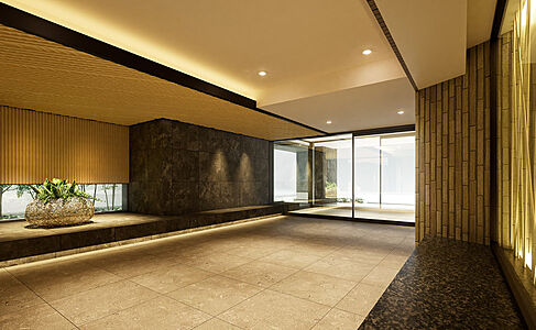 武蔵小山がもつ伝統的な情緒や歴史、これからの新しい未来という二面性を織り交ぜた空間を創造したエントランスホール。日本らしい格子模様や竹林を思わせる意匠とアートが、迎賓のスペースをひときわ凛とした繊細な表情に仕上げています。
