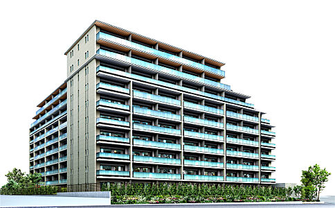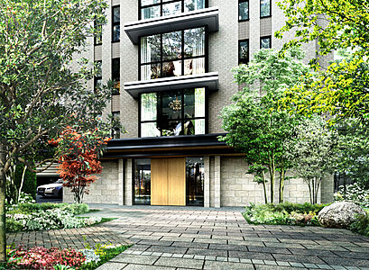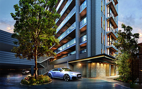 メインファサードでは、中央をカーテンウォールとし、左右にシンメトリーなスリット窓を配置することで建物形状の陰影により品格ある表情を演出。端正なレジデンスを実現しました。