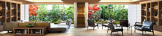 奥行きのあるエントランスホールとラウンジ。住まいに入ると広がるのはゆったりと伸びるエントランスホール。さらにその空間に寄り添うラウンジを設けました。植栽を眺めながらゆったりと過ごす、住まう方だけ贅沢な空間としています。