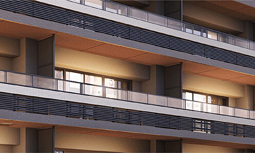 採光と心地よい風を迎えるルーバー&ガラス手摺り。水平デザインがシンボリックな印象に。
