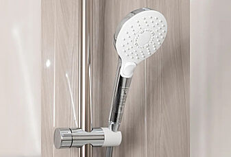 シャワーヘッドの高さや角度を自由に変えられるスライドバーが、立ち座りのサポートバー兼用となります。※浴槽の正面側またぎ部分に設置※一部住戸を除く