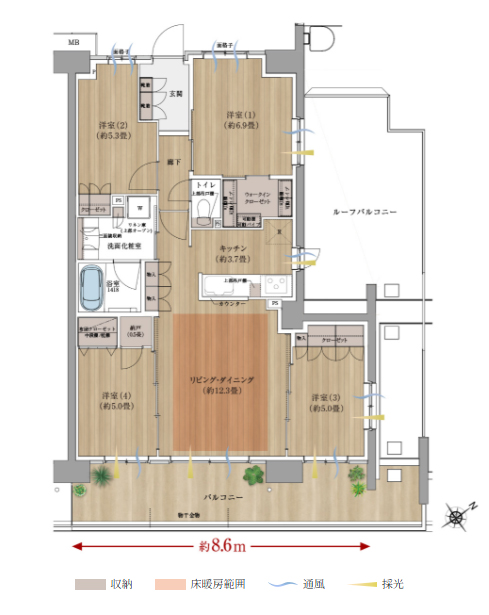 | 備考 | ■上層階の開放感を満喫できるルーフバルコニーを備えた3面開口の角住戸プラン。 ■約8.6mのワイドなスパンを活かし、明るいバルコニー側に3室をレイアウト。 ■ウォークインクローゼット、布団クローゼット、納戸など豊富な収納スペースを確保。 ■洋室(3)・洋室(4)は引き戸を開放してリビング・ダイニングとの一体利用が可能。 |