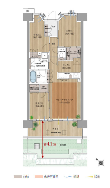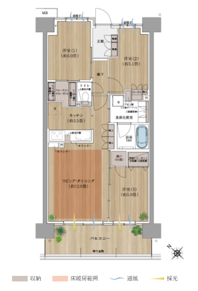 | 備考 | ■2面に開口部を設け通風・採光を確保した角住戸プラン。 ■リビング・ダイニングと洋室(1)は2面採光。キッチンにも窓を設置。 ■ウォークインクローゼット、布団クローゼット、納戸など豊富な収納スペースを確保。 ■洋室(3)は引き戸を開放してリビング・ダイニングとの一体利用が可能。 |