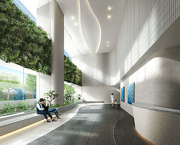 当マンションでは、免震構造を採用しています。免震装置(積層ゴム、ダンパー等)を建物の基礎と上部建物の間に設置することにより、地震などの揺れを吸収・分散し、地震の激しい横揺れを低減します。※建物周辺の構築物、外構・植栽、免震装置より下部の構造躯体・配管等については免震構造となっておりません。