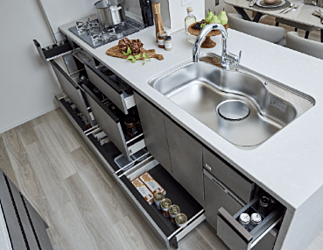 調味料等を一列に整頓して収納できます。コンロの脇にあるので、お料理もスムーズです。