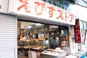 えびすストアは、東口から通り抜けができる商店街ストリート。八百屋、2軒の鮮魚店、飲食店、リサイクルショップなど、32店舗が入っています。