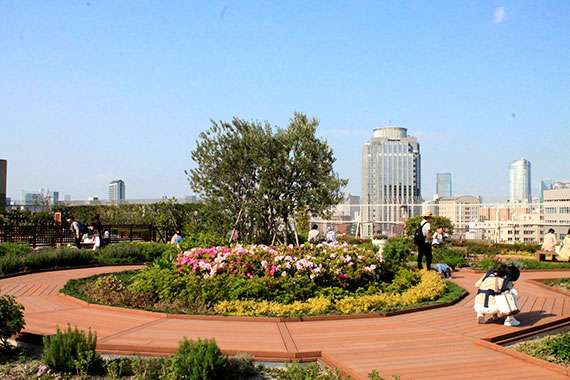アトレ恵比寿の屋上庭園「ebisu green garden(エビスグリーンガーデン)」。総面積約2,100平方メートルにウッドデッキや花壇、芝生があります。子連れのママや、ランチを食べるオフィスワーカーが集う、まさに都会のオアシス! 貸し菜園(ソラドファーム)も隣接しています。
