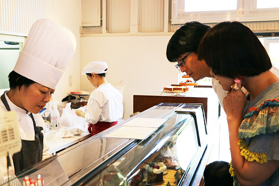 お気に入りのパティスリー エーケーラボでケーキ選び。マンションの近くにあるので、急なお客様がいらしたときに、できたてスイーツを買いに来ることも多いのだとか。