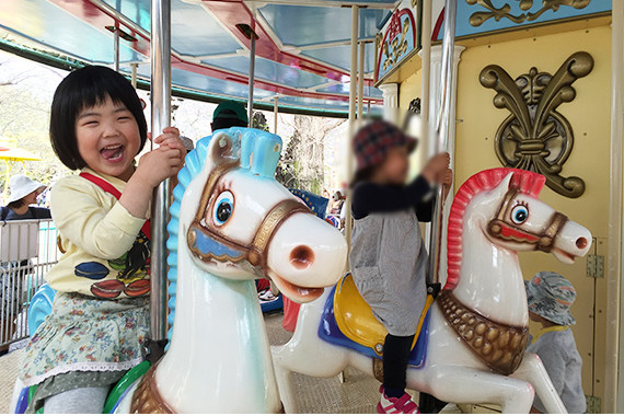井の頭自然文化園のメリーゴーラウンドに乗るAちゃん。習い事も楽しく学んでいます。