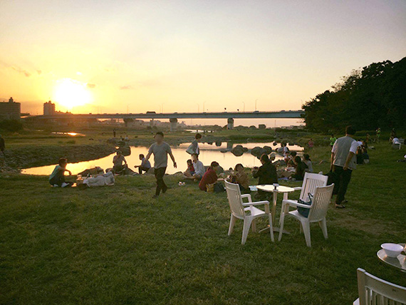 多摩川河川敷の水辺公共空間の活用、水辺ビアパーティやお茶会