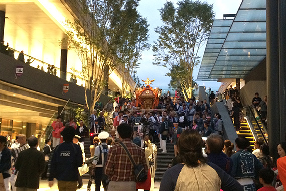 瀬田玉川神社例大祭の御神輿は、二子玉川駅改札前や二子玉川ライズのガレリアを通って、