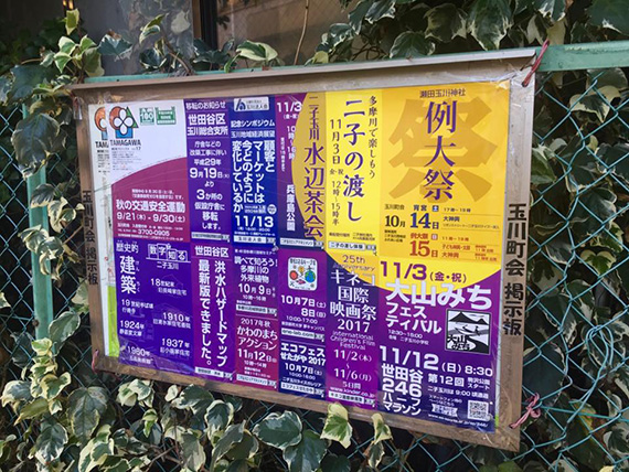玉川町会掲示板に掲示された、街情報プロジェクト秋号Vol.17。