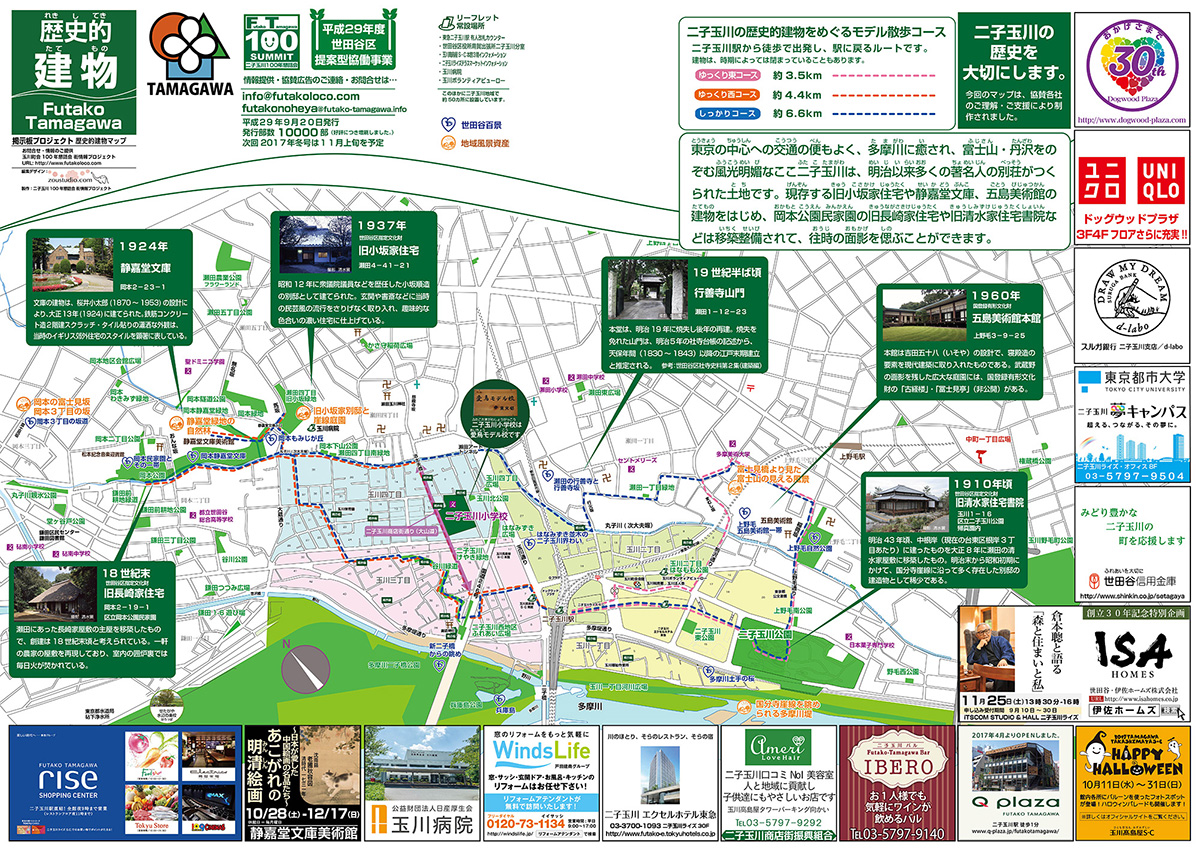 江口さん玉川町会の掲示板に貼り出すA1ポスターは、雨に濡れても強いコーティング用紙1枚にまとめて掲載しています。その他に、配付用のA3リーフレットがあり、裏面に「春の散歩」「歴史的建物」「二子玉川に生息する両生類・爬虫類」など毎号1テーマで編集して街を紹介しています。この街が凄いと思うのは、毎回のテーマ探しに全然困らないこと。歴史、自然、建築、美術館などが揃っていて、奥が深い街だなといつも感心しています。
