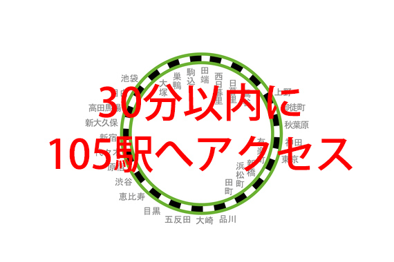 山手線円内にあるJR・地下鉄のどの駅にも30分以内で到着できる!