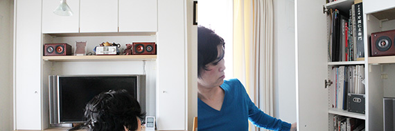 作り付けのテレビボードは、右側がご主人、左側が奥様。左右で夫婦それぞれの場所を決めて管理しています。