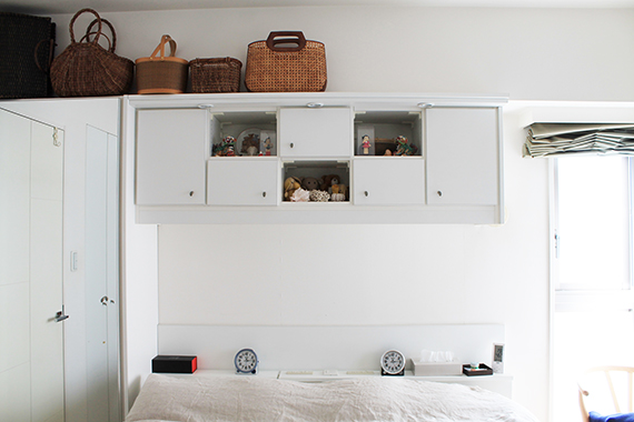 かみてさんの大好きな籠バッグコレクションは寝室の棚の上に、「見せる」収納。