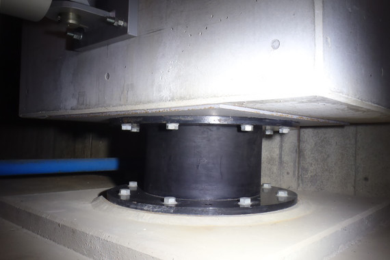 免震装置(マンションの基礎部分に設置された免震ゴムが、地震のエネルギーを吸収して、建物内部の被害を最小限に食い止める効果があります)