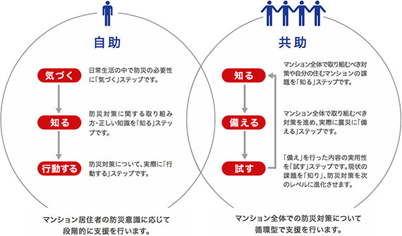 「共助」では、マンション全体で協力しあうために、まず防災講座などからマンションの課題を「知る」、備蓄品やルールを「備える」、防災訓練で実際にそれらを「試す」ことで、また現状の課題を「知る」という循環型の防災対策を行っていただきます。エレベーターが停止したときに階段避難車を使って要支援者を安全に運ぶ防災訓練などは、やはり実際に試してみないとわかりませんからね。