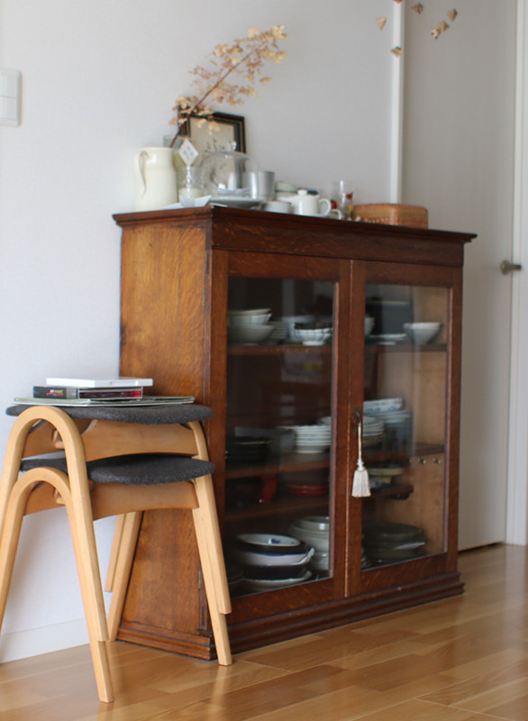 食器が大好きな柳沢さんですが、この棚に入るだけの食器数しか持たないというのが、マイルール。アンティークのブックシェルフなので、奥行きも浅めの30㎝程度。下段に重くて大きい器、中段には中サイズの器、上段には小ぶりな器をまとめています。