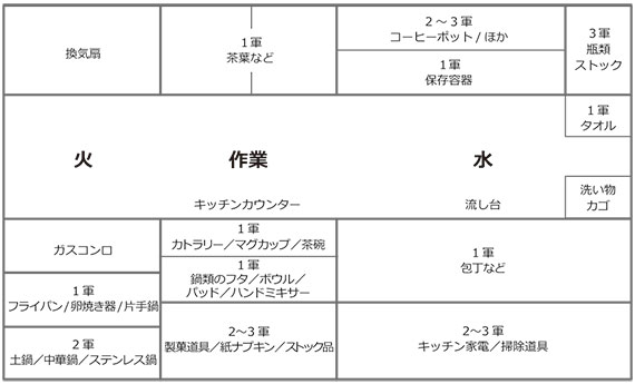 ガス台、作業台、流し台の収納ルールを表すゾーニング図。