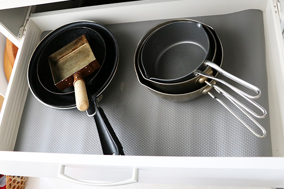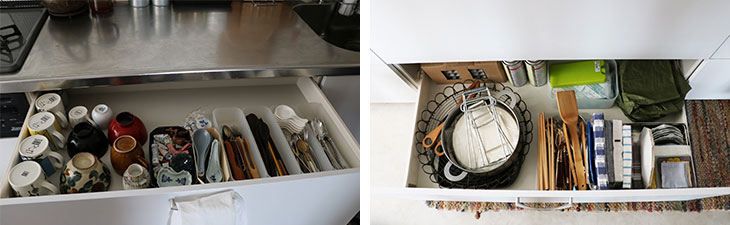 キッチンの吊り戸棚や引き出しを開けると驚くのが、収納スペースの余白の多さ! スペースに対して8割くらいしかモノが入っていません。しかし、鍋やフライパンも、二人暮らしのご夫婦ならばあたりまえの数。いえ、それよりも多いかもしれません。なのに、どうしてこんなに余裕があるのでしょう?