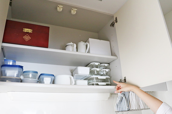 作業台の吊り戸棚には、ふだん活躍する保存容器が並んでいます。ここも8割収納。いえ、それ以下かも!?