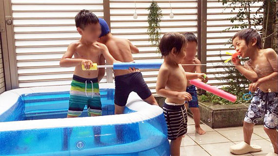 バルコニーに置いた子ども用プールで、お友達と水遊びするMさんのお子さんお二人(写真向かって右側)。楽しそうです。