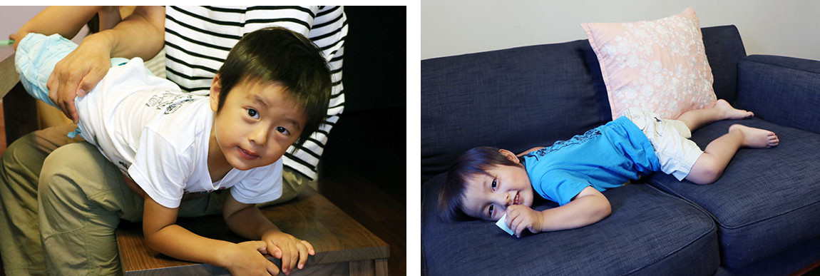 お父さんの膝で甘えるお兄ちゃんのYくんと、リビングのソファでくつろぐ弟のRくん。仲良し兄弟です。