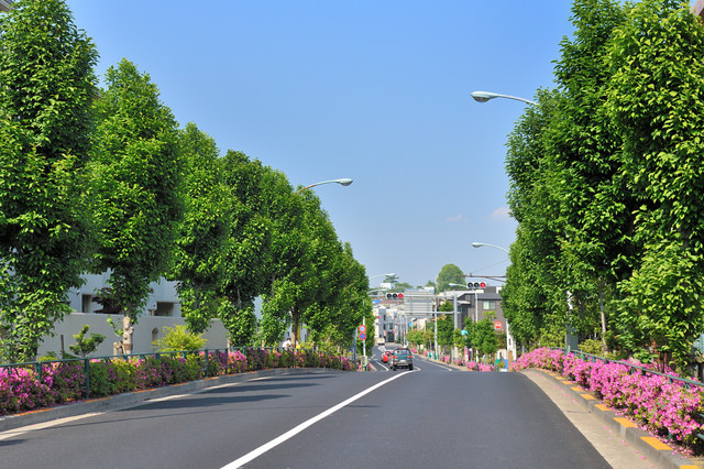 街路樹が並び、緑いっぱいに整備された駒沢通り。徒歩圏には、公園、多摩川、美術館などがあります。