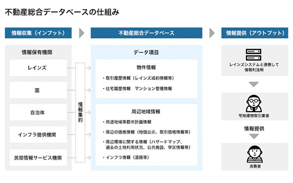 長嶋さん「国土交通省が推進している、不動産に関わる情報をストックしていくためのシステム『不動産総合データベース』がそうです。現在、横浜市・静岡市・大阪市・福岡市に所在する一戸建てやマンション、土地の売買物件の情報を以下の図の仕組みのように収集しています。将来的には、日本全国の不動産に関する情報を収集して、当初は業者間で共有、やがてはすべての人に開示していく展望が持たれています」