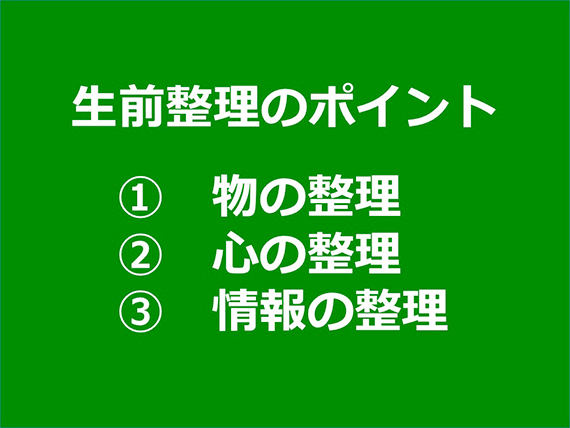 「情報」の整理は、資産、人間関係、介護やターミナルケア(終末期医療)の方法、葬儀の希望を整理して、将来の意思を子ども達に伝えます。これら3つの作業を行うことで、自分の人生の棚卸しが出来、新たな人生の計画や希望が湧いてきます。