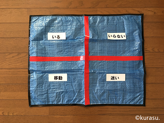 香川さんすべて「いる/いらない」で片付けてしまおうとすると、悩んだり混乱したりします。写真のような「いる/いらない/移動/迷い」の4分類シートで物を分類していくと、うまく仕分けできます。「迷い」は、思い出として残すか手放すか迷ってしまう物。判断の基準は8秒間がベストです。「迷い」に分類した物は、空き箱や袋に入れておき、半年後にまた開けて仕分けします。「移動」は、確実に思い出として残したい物または他の部屋に移動したい物を分類します。4分類シートは、写真のように大きなブルーシートにガムテープで4分類して自作できます。まずはこういう片付けの手法を学ぶことから始めてはいかがでしょうか?
