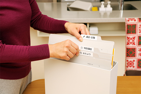 学校のおたよりや仕事書類はキッチンのファイルボックスに一時置き場を確保。