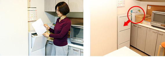 望月さん行動動線の例でいえば、我が家にはキッチンにプリントや書類の一時置き場が設けてあります。大切な紙の情報はここに一カ所にまとめるルールです。不要になったものは抜き出して、すぐ隣にある分別ゴミ箱へ。瞬時に片付けが終わります。