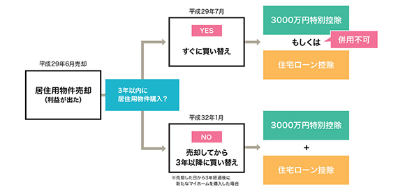 またこれは変則的ですが、先に次の新居を購入・引っ越して住宅ローン控除を受け、引っ越した年とその後の2年の計3年経過した翌年に旧居を売却するパターン(平成29年に引っ越した場合は平成32年に売却する)でも、3,000万円控除と住宅ローン控除を併用することができます。詳しくは税理士さんにご相談ください。