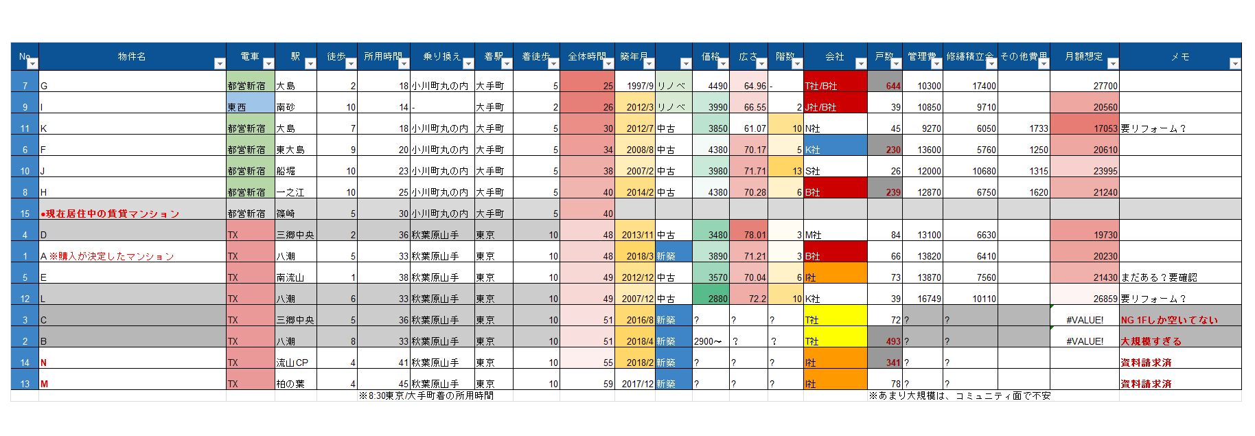 Fさんの自作比較検討表はよく出来ていて、 検討候補マンションから会社までの朝8:30台の乗り換え・徒歩時間・全体所要時間、築年数・広さ・階数・戸数・管理費・修繕積立金などが一覧となっていて、項目毎に並べ替えできます。これは是非とも真似したいアイデアですね。