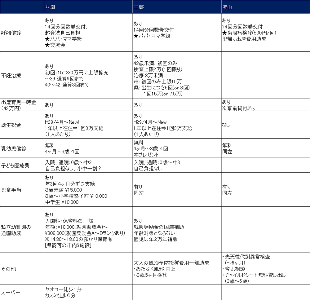 Fさん「路線から八潮・三郷・流山にある物件に絞られてくると、奥さんが地域の子育て支援制度の比較表を作っていました。子育て面では流山がいいと言われていますが、基本的な子育て支援制度については、流山にあって八潮にないというものはあまりなかったようですね」