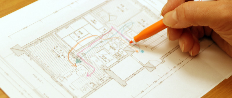 また、間取り図があれば、家族がどんな動きで生活するのか、行動動線を書き入れてみてください。帰宅してから出かけるまでの一日の暮らしを想像していくと、どこに何があれば便利というのが可視化できるはずです。間取り図に行動動線を書き入れてみる作業って、結構楽しいですよ(笑)。